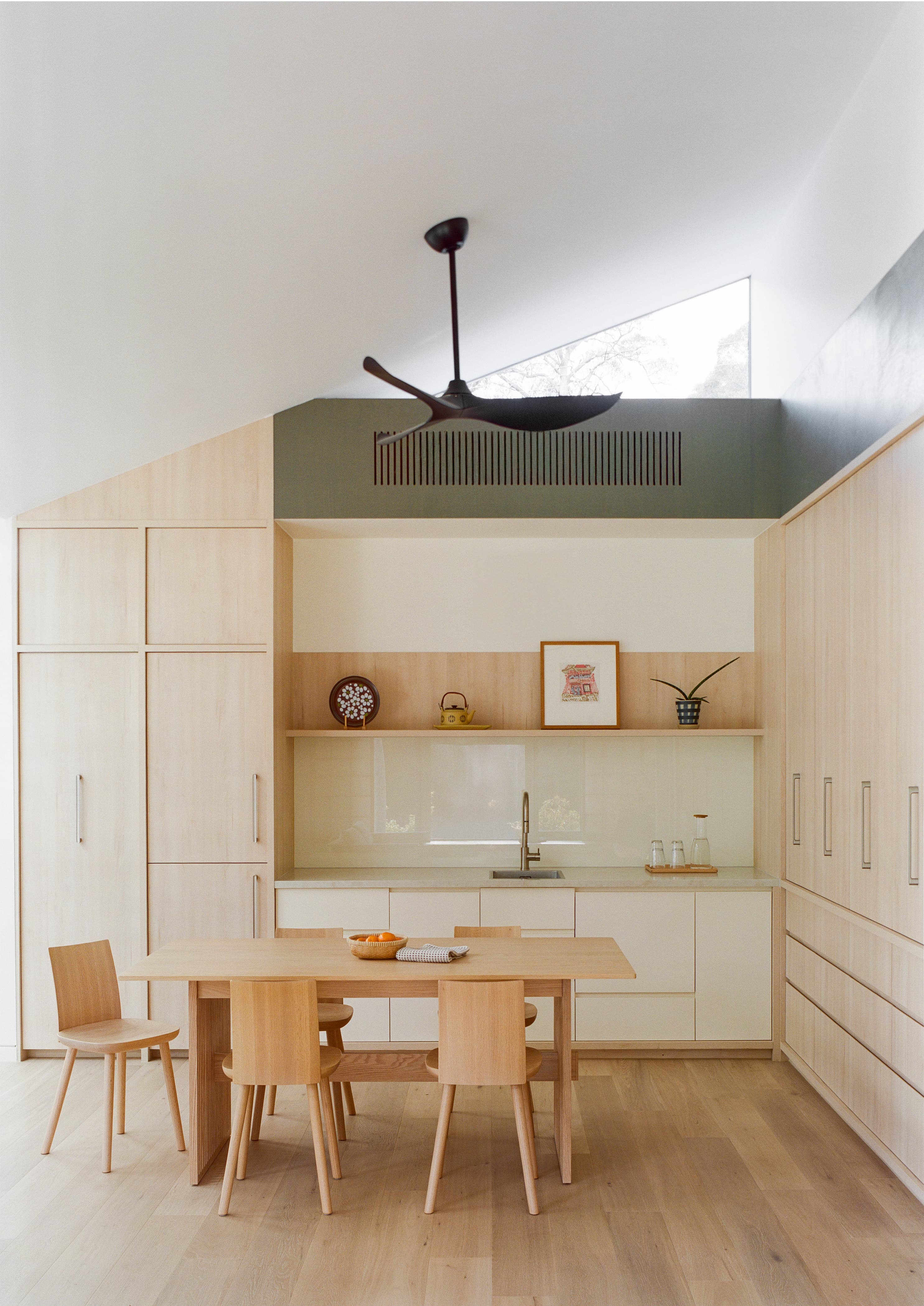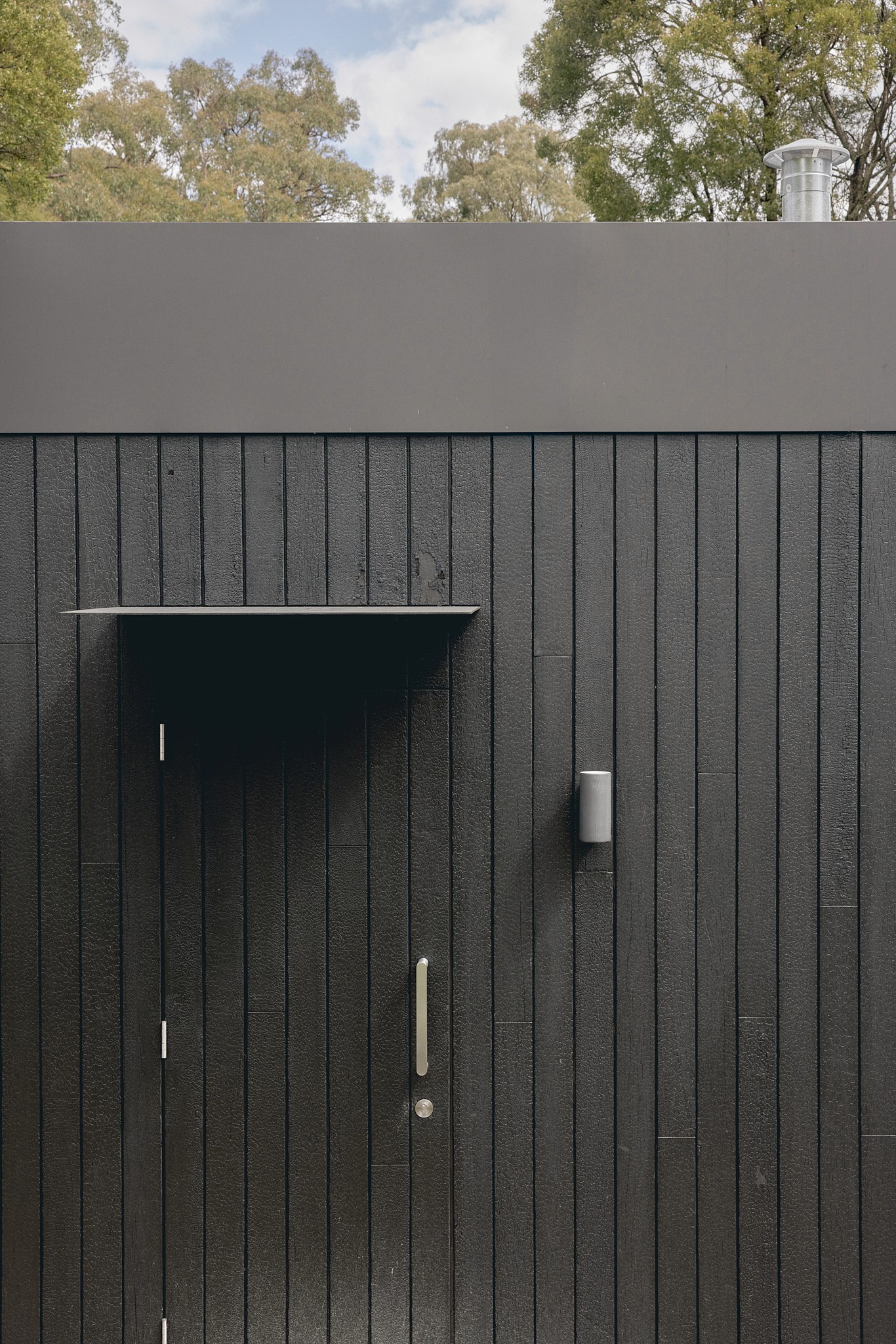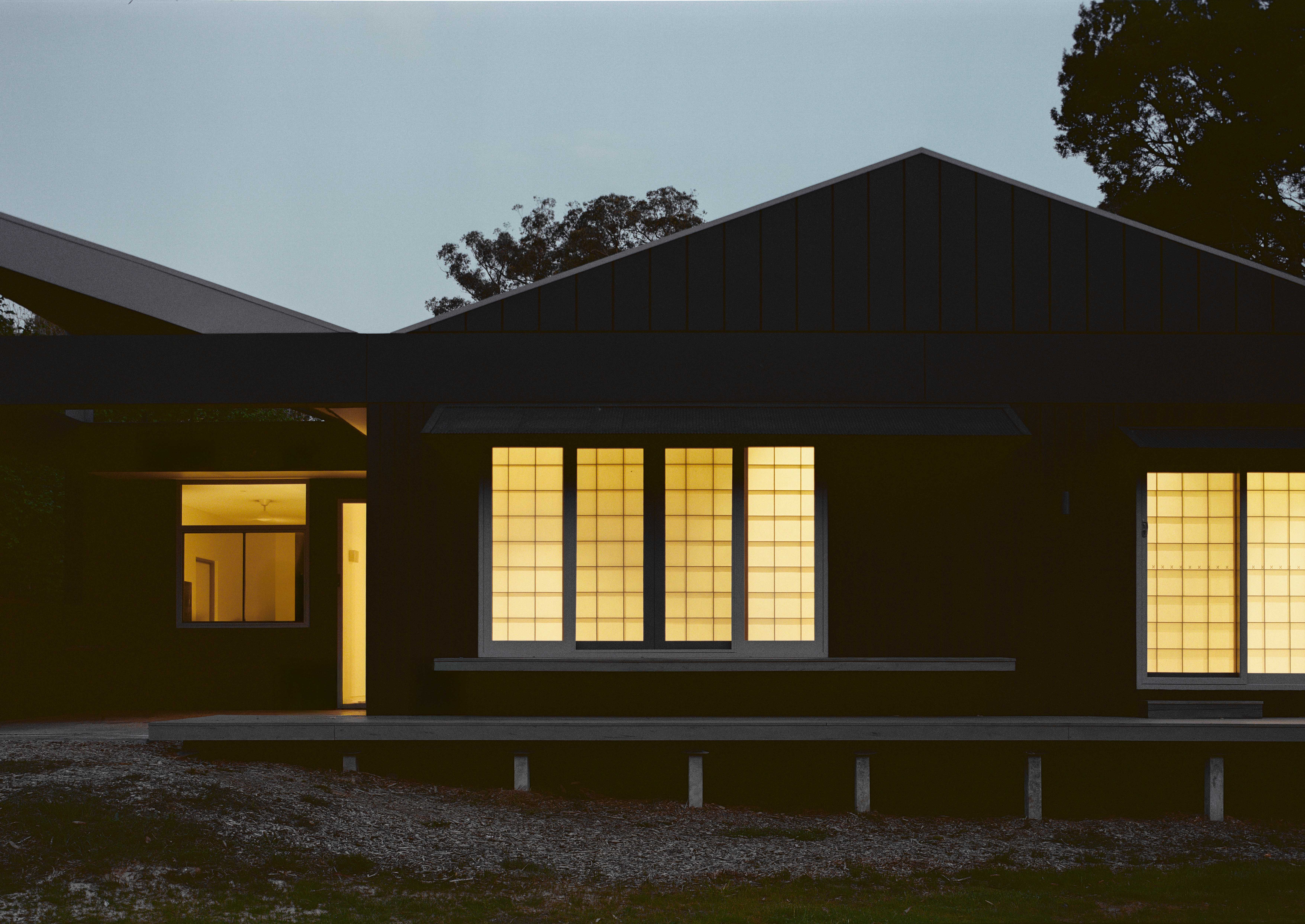 Two materials define the exterior: Shou Sugi Ban charred timber and Colorbond metal cladding, both suited to the bushfire zone and chosen for their durability — one rooted in Japanese craft tradition, the other distinctly Australian.