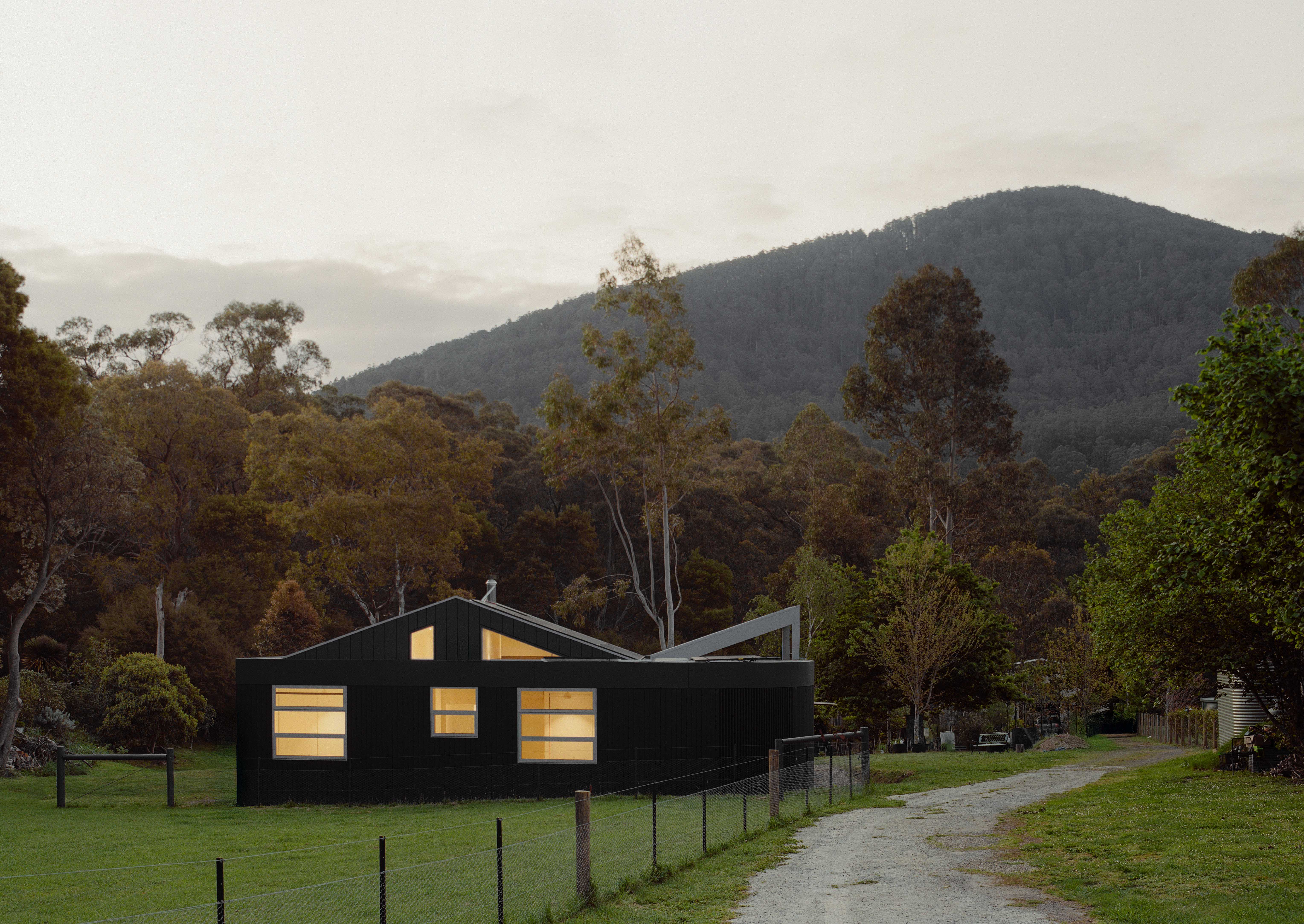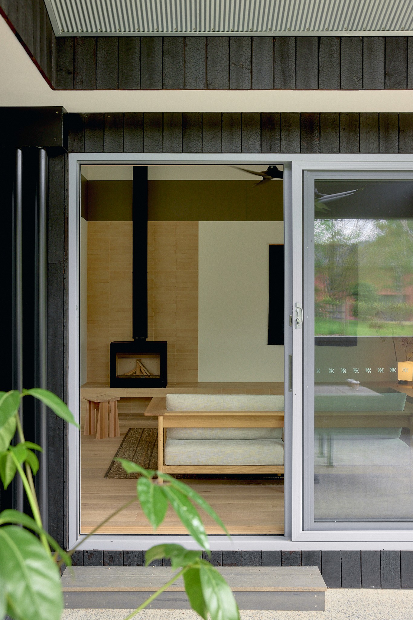 Two materials define the exterior: Shou Sugi Ban charred timber and Colorbond metal cladding, both suited to the bushfire zone and chosen for their durability — one rooted in Japanese craft tradition, the other distinctly Australian.
