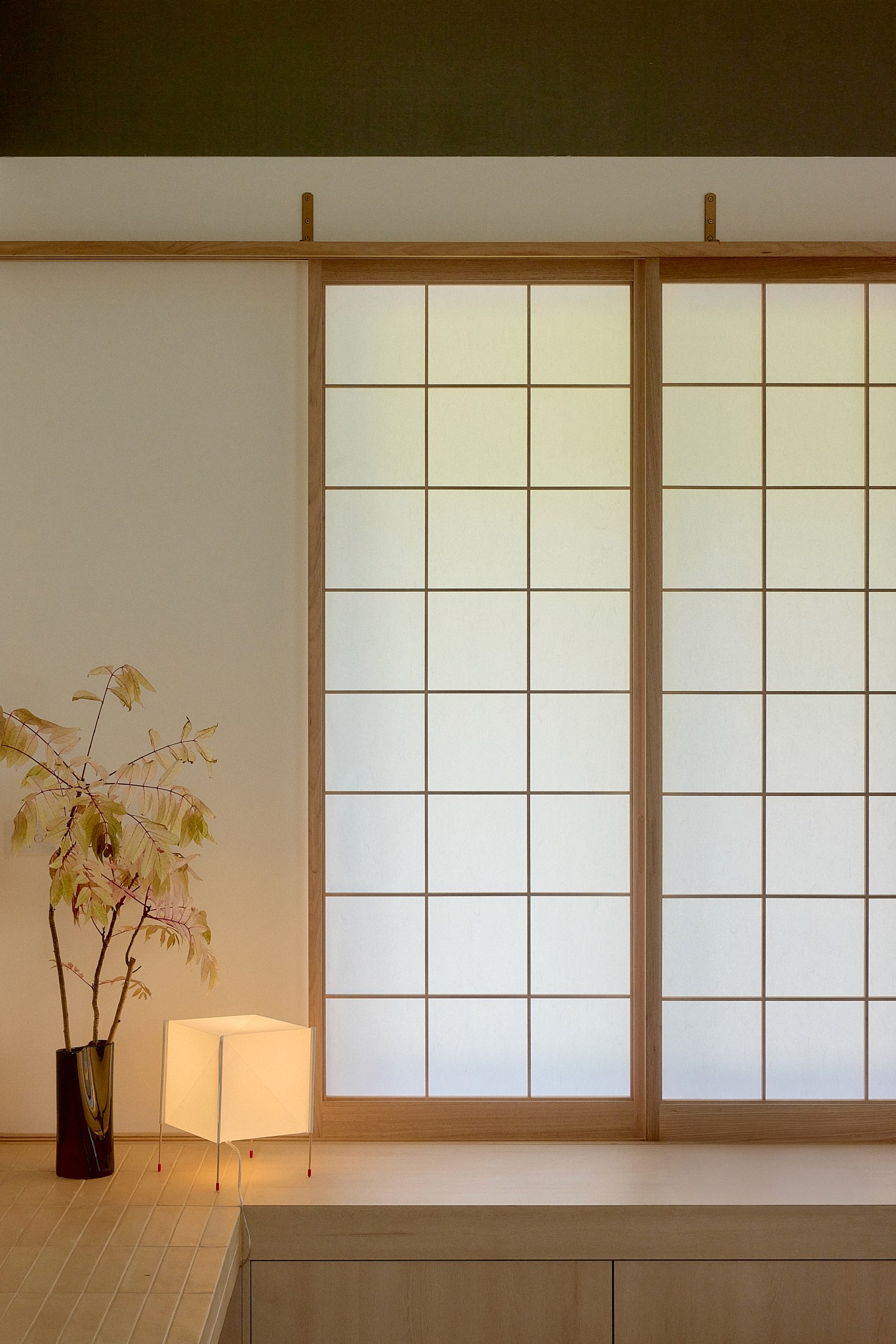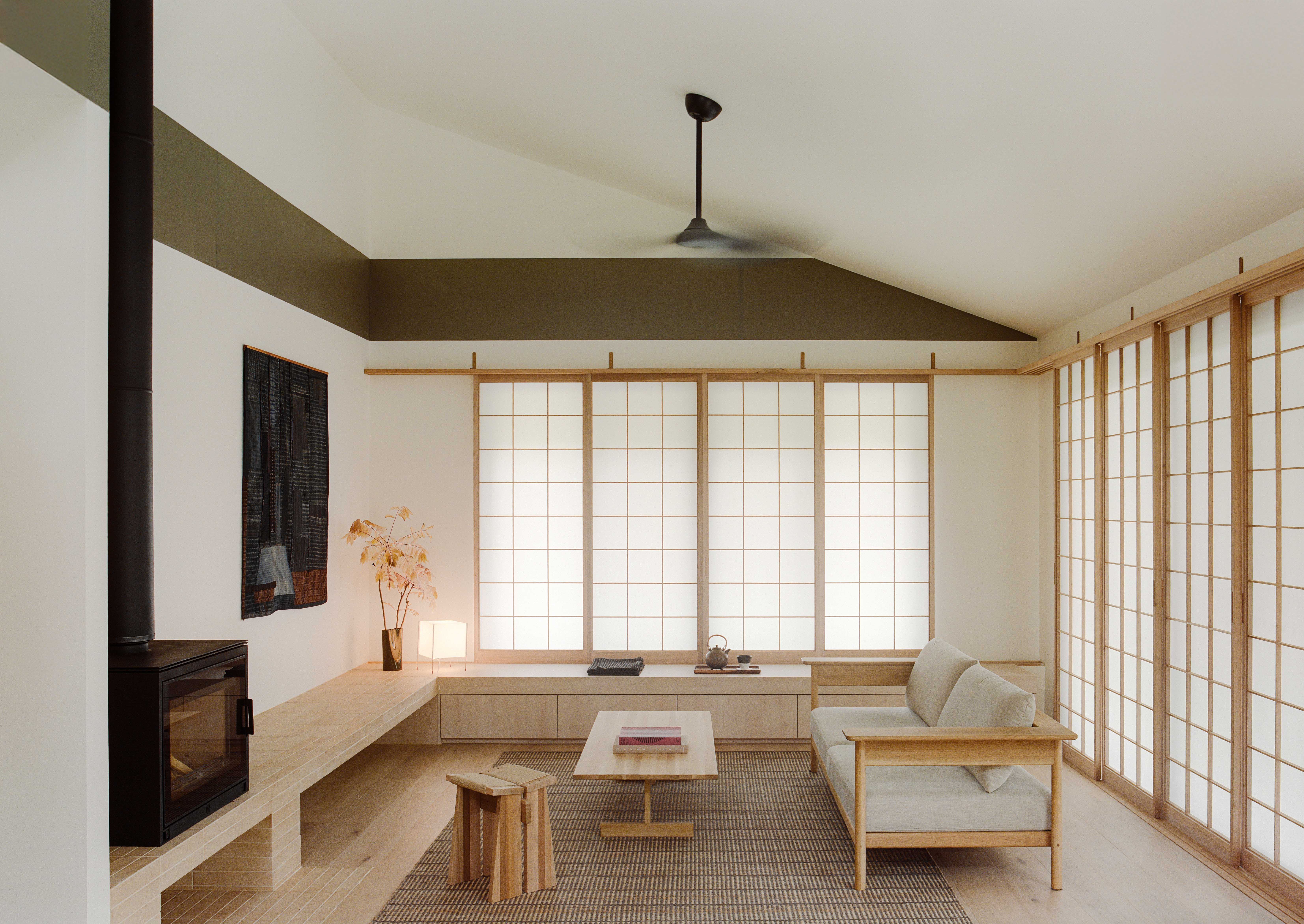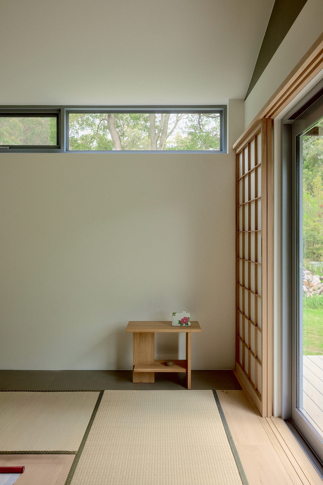 The design draws from Japanese spatial principles. A concrete doma marks the entry. Shoji screens filter natural light and frame the wetland view beyond. A tatami floor library offers a place of quiet retreat. An engawa-like deck wraps the perimeter, blurring the boundary between inside and outside.